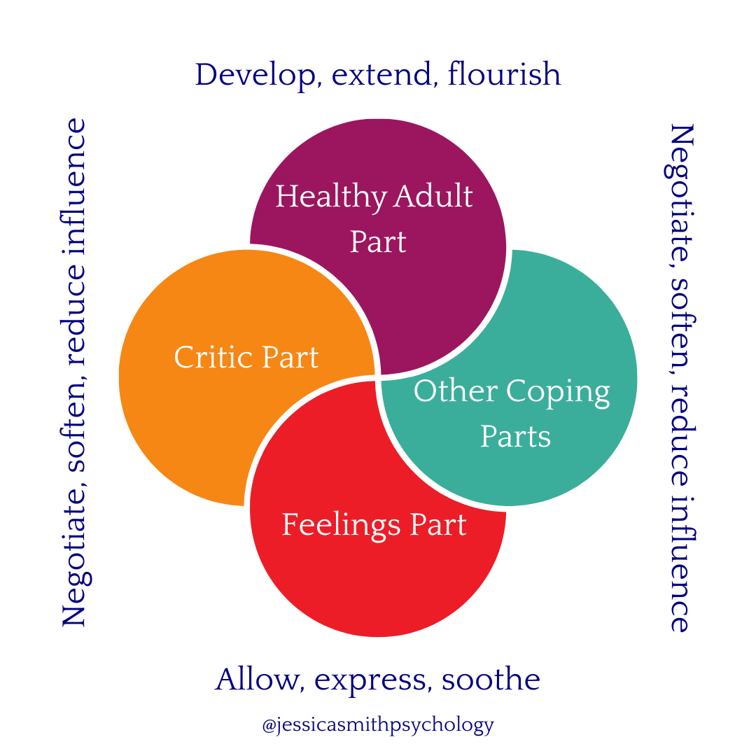 When these needs go chronically unmet during childhood and adolescence, depending on temperament and other factors, we can tend to develop schemas (e.g., emotional deprivation, self-sacrifice, unrelenting standards) and coping modes or parts (e.g., a critic part, a perfectionist part, a detached part).